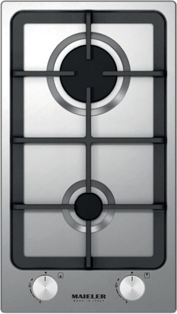 موقد غاز مدمج من الفولاذ المقاوم للصدأ MH1013IX1 (30 سم) مع 2 شعلة غاز، وإشعال تلقائي، وأمان كامل (FFD)، ومقابض نيكل مقاومة للحرارة. لوحة تحكم أمامية بأبعاد مدمجة: 275 × 495 مم.
